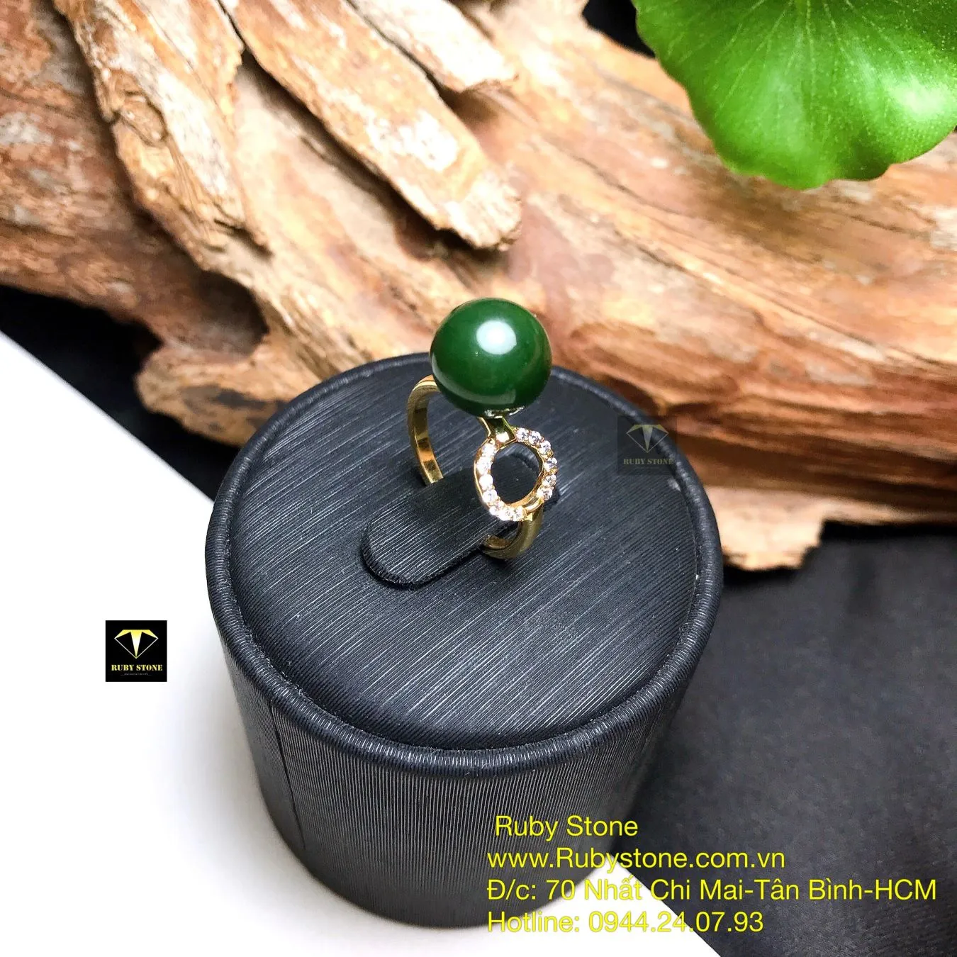 Nhẫn trái châu Ngọc bích xanh đậm, vàng 18k