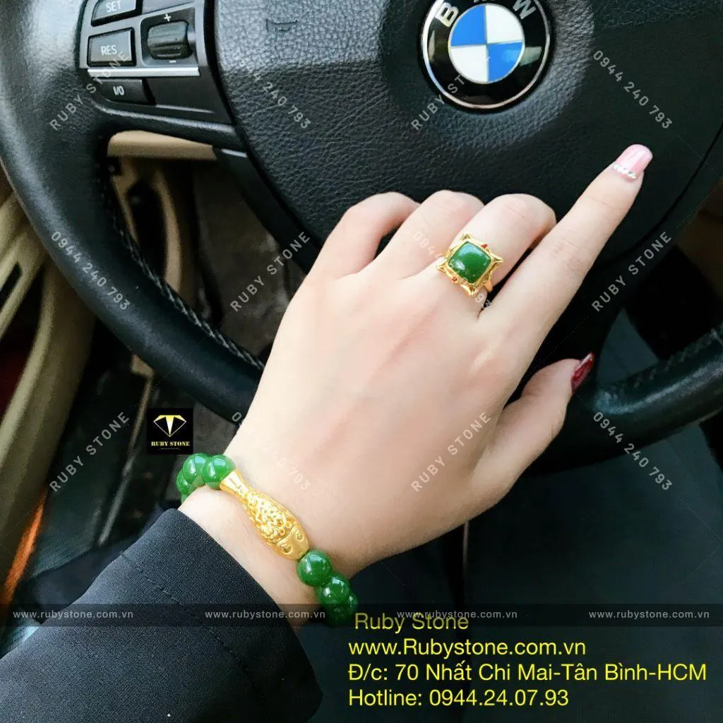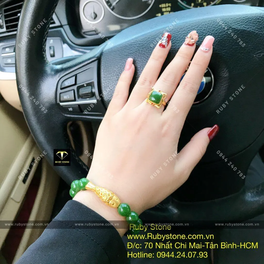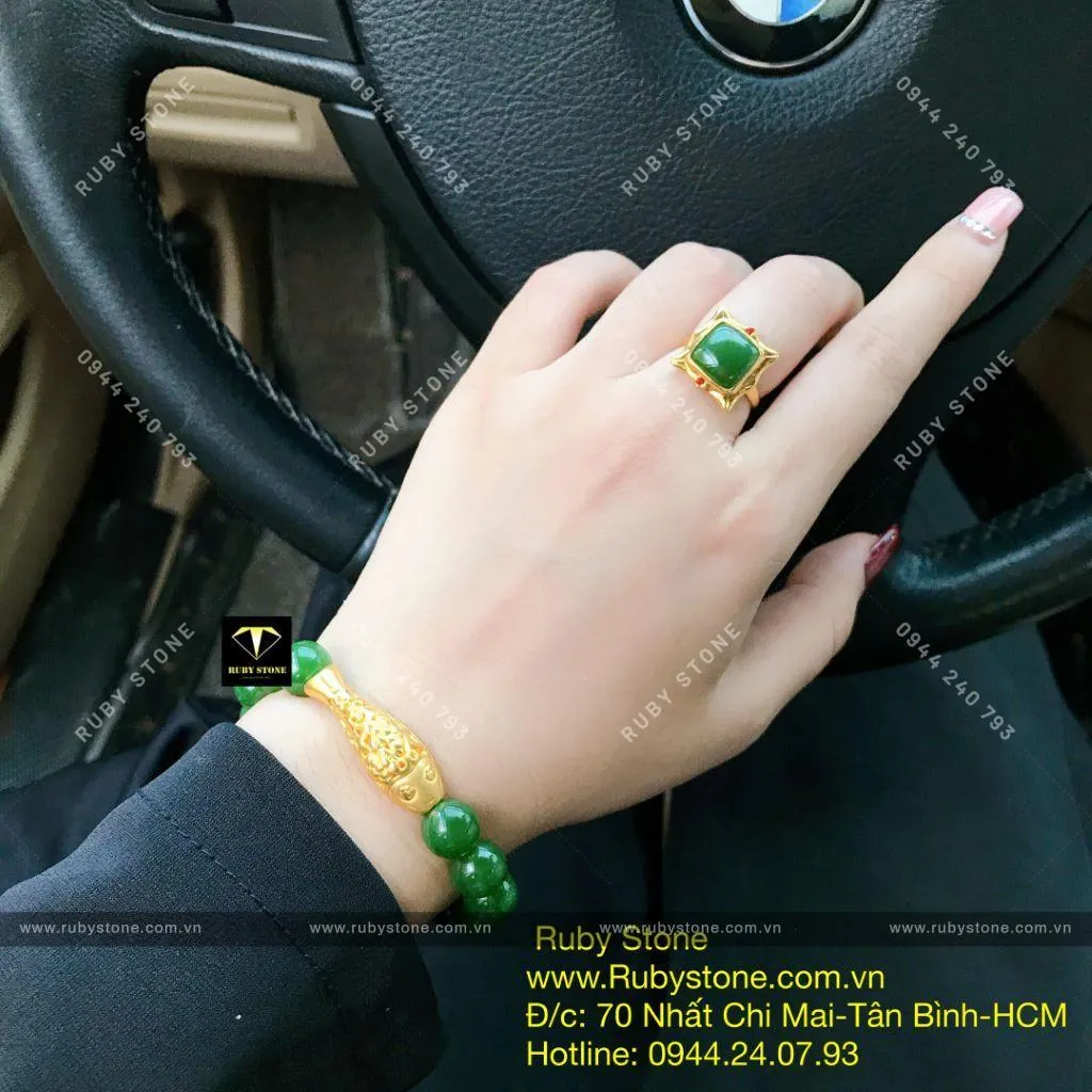 Bộ Sản Phẩm Vòng Ngọc Bích Mix Charm Vàng 24k Và Nhẫn ổ Vuông, Vàng 10k - Ngọc Bích Phong Thủy