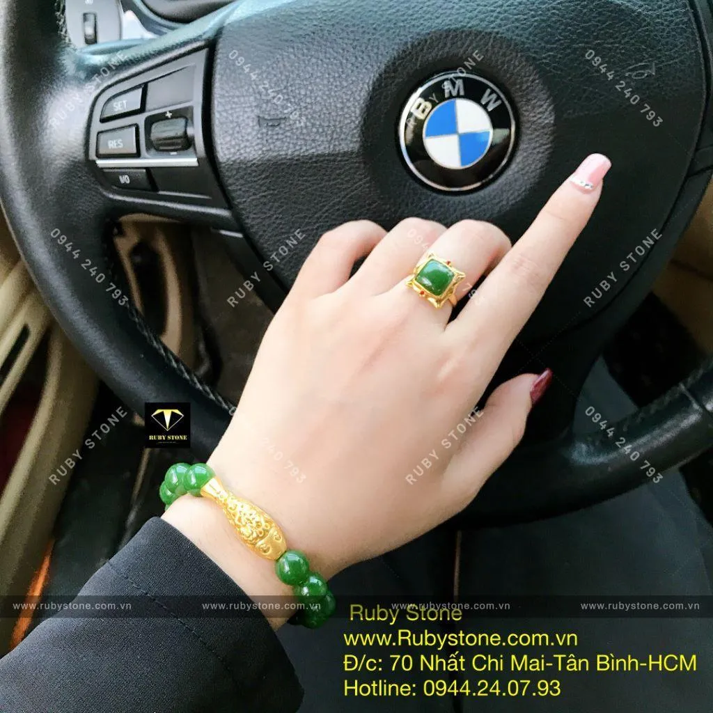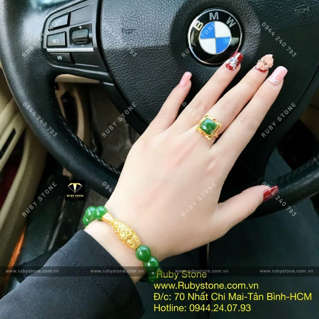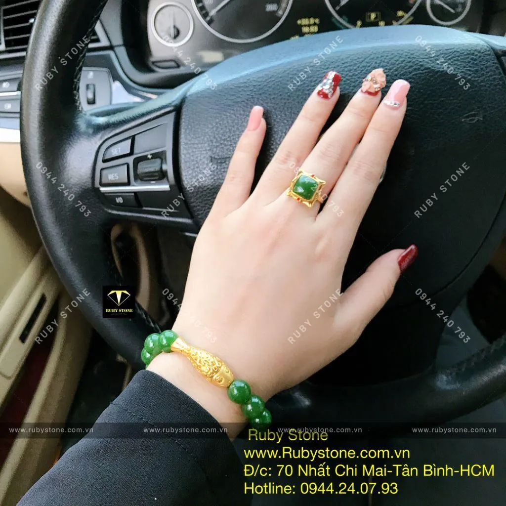 Bộ Sản Phẩm Vòng Ngọc Bích Mix Charm Vàng 24k Và Nhẫn ổ Vuông, Vàng 10k - Ngọc Bích Phong Thủy