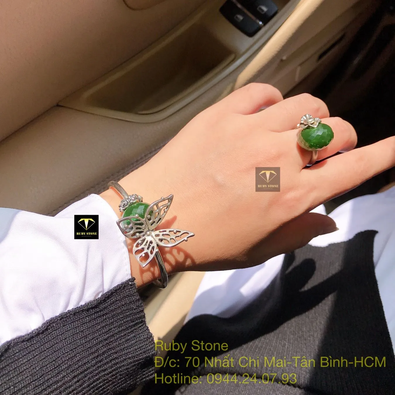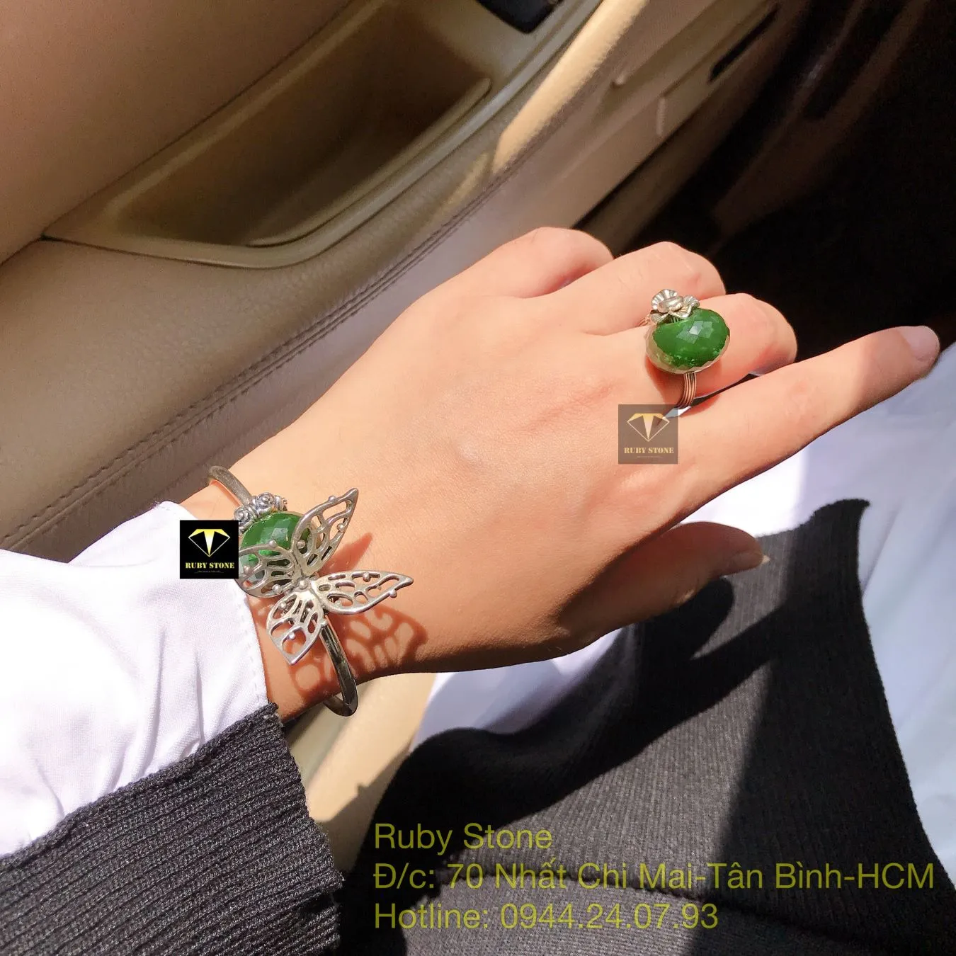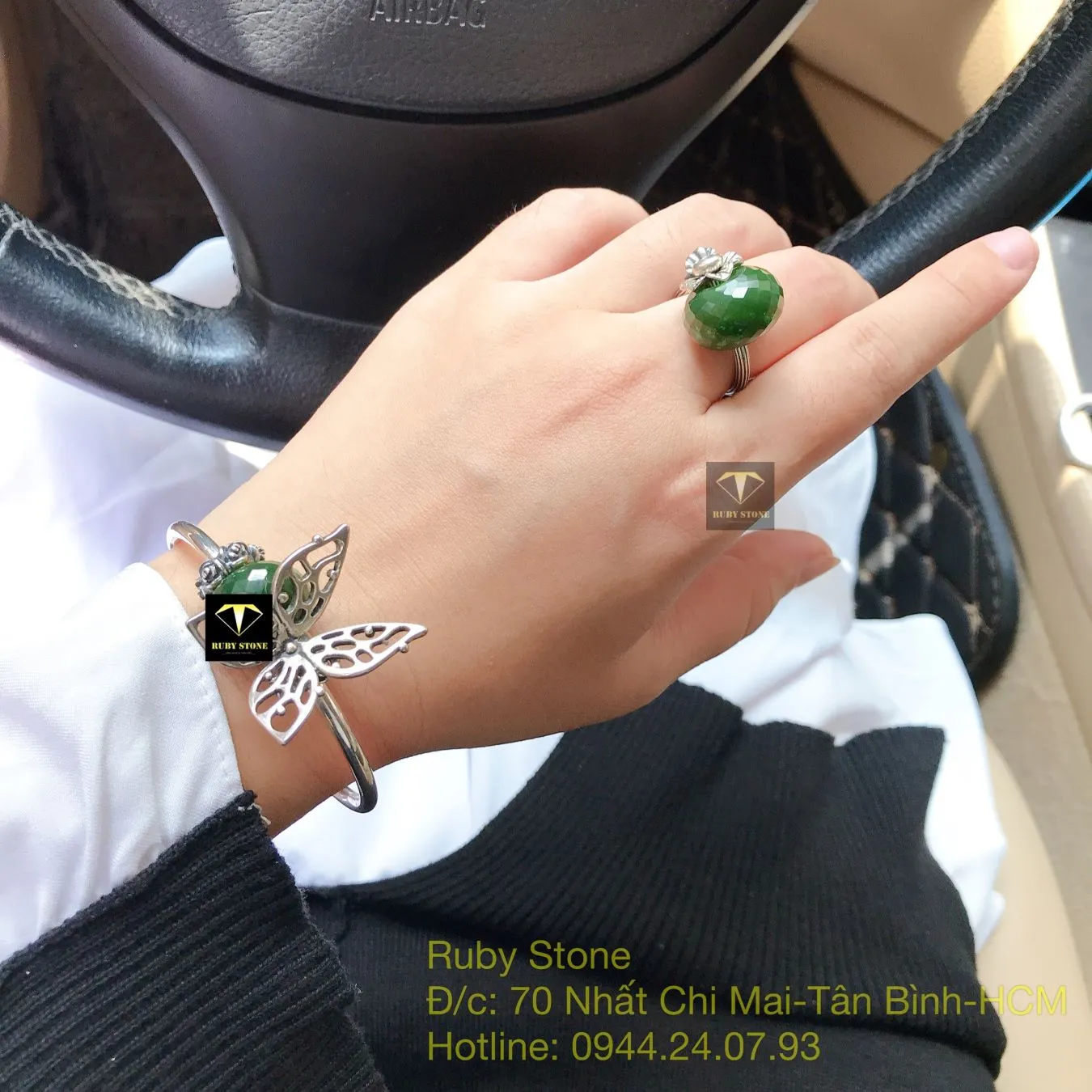 Bộ sản phẩm vòng và nhẫn bạc mix charm Ngọc bích mài giác