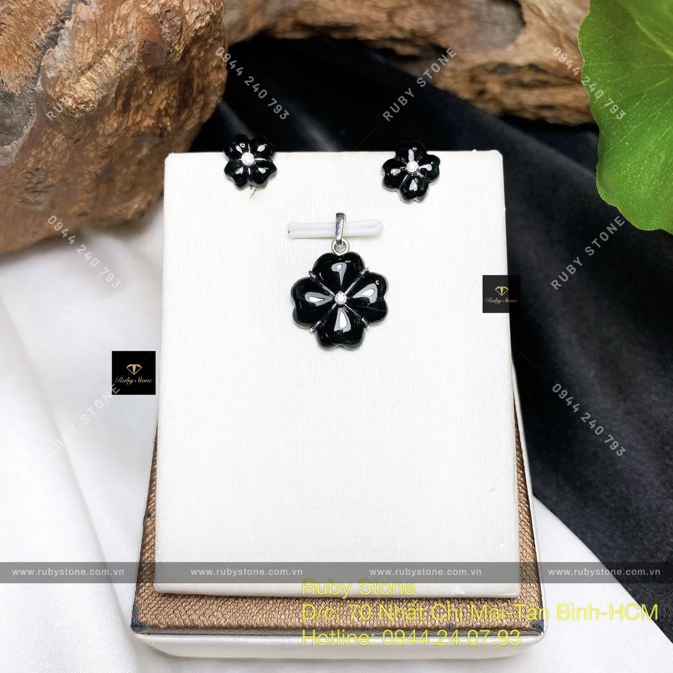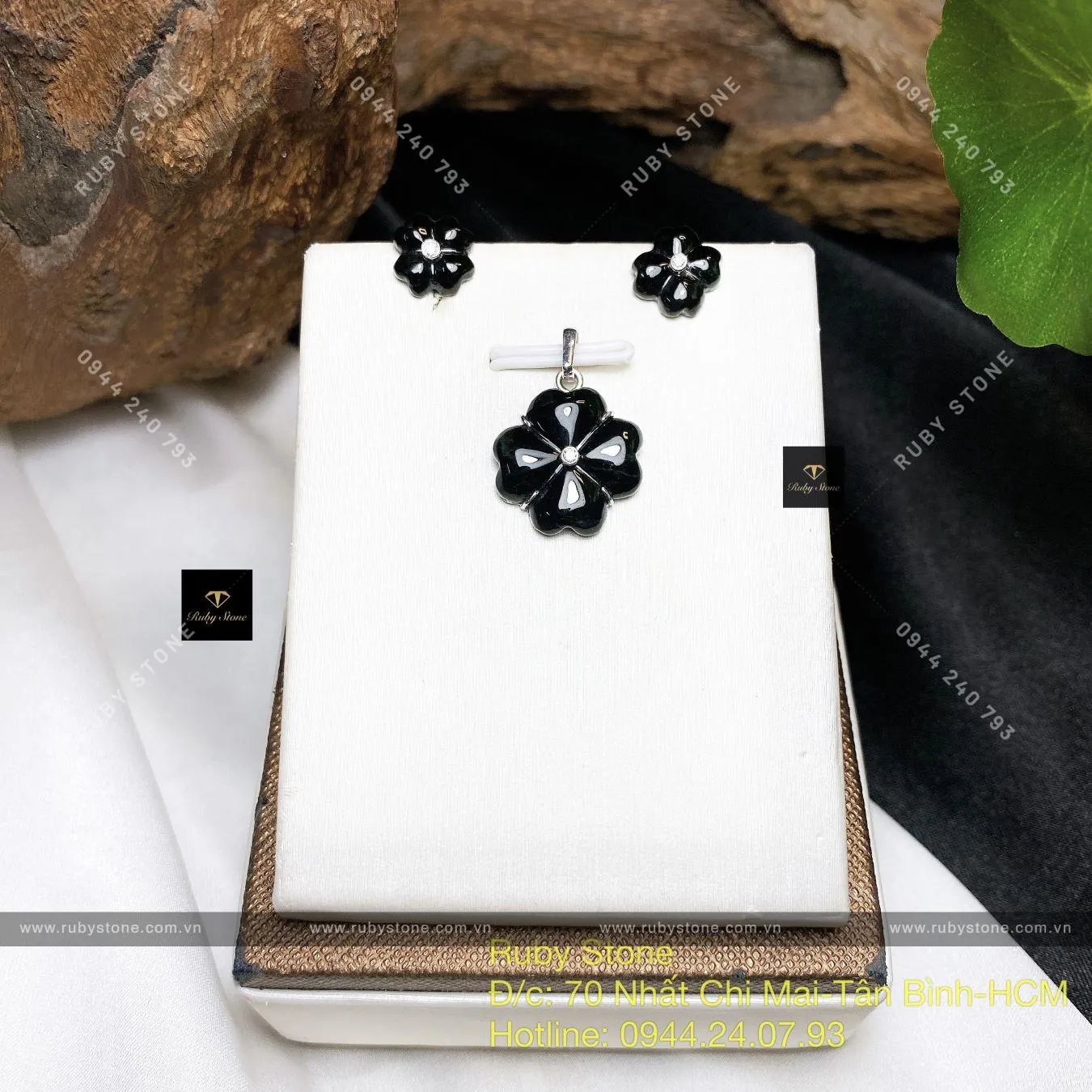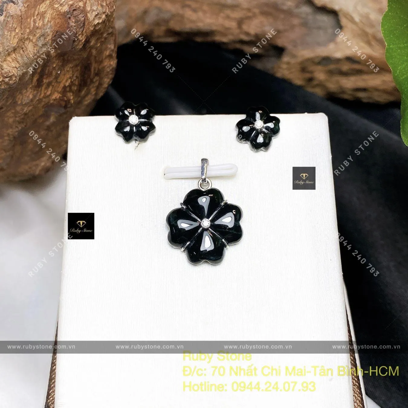 Bộ Trang Sức Cỏ Bốn Cánh Phỉ Thuý Mực Dục, Vàng 18k, Kim Cương Thiên Nhiên - Ngọc Bích Phong Thủy