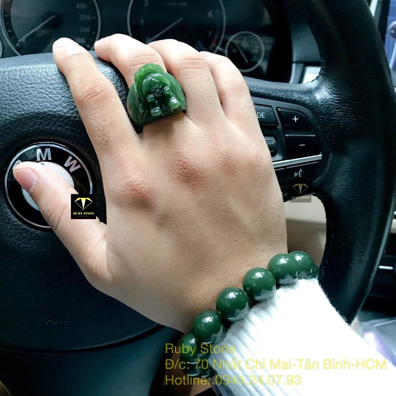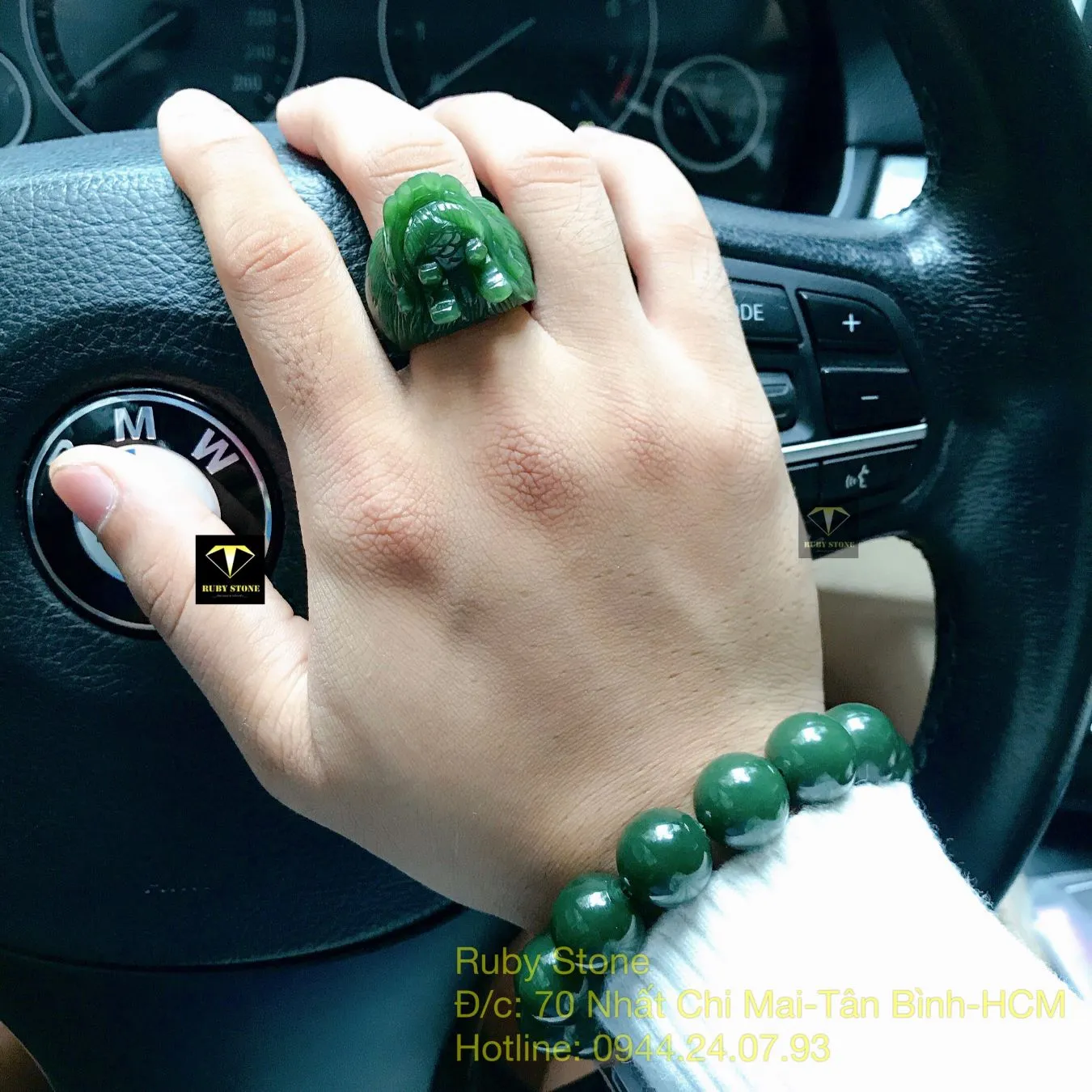 Bộ Vòng Chuỗi Ngọc Bích Xanh đậm Vip 14 Ly Và Nhẫn đầu Rồng - Ngọc Bích Phong Thủy