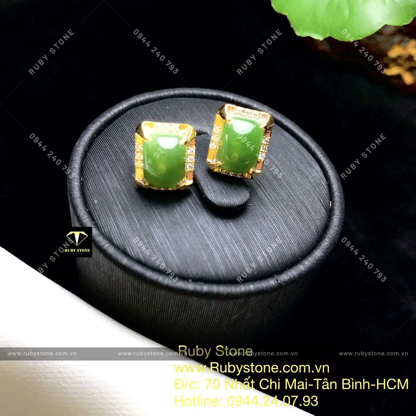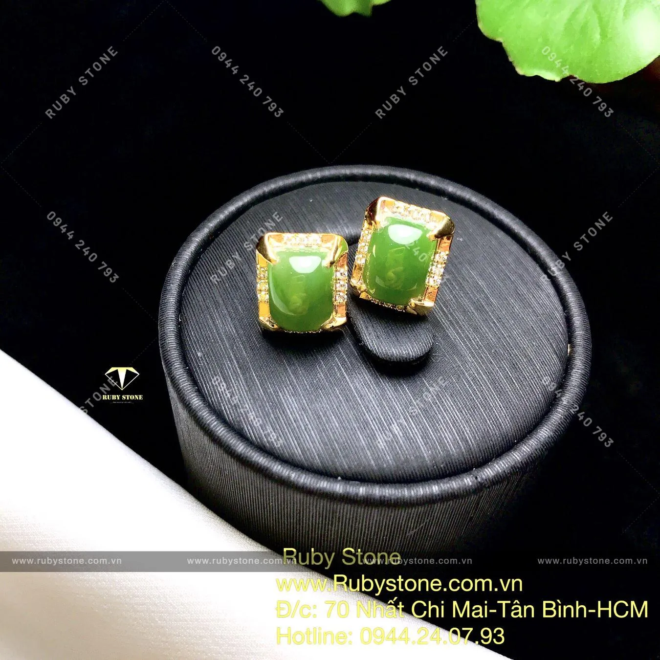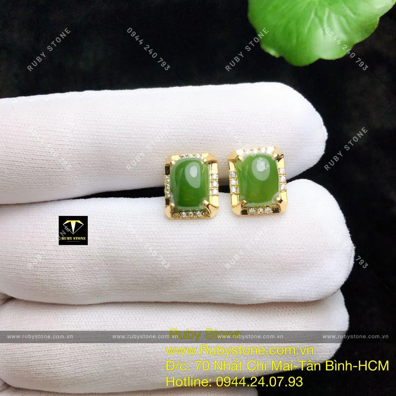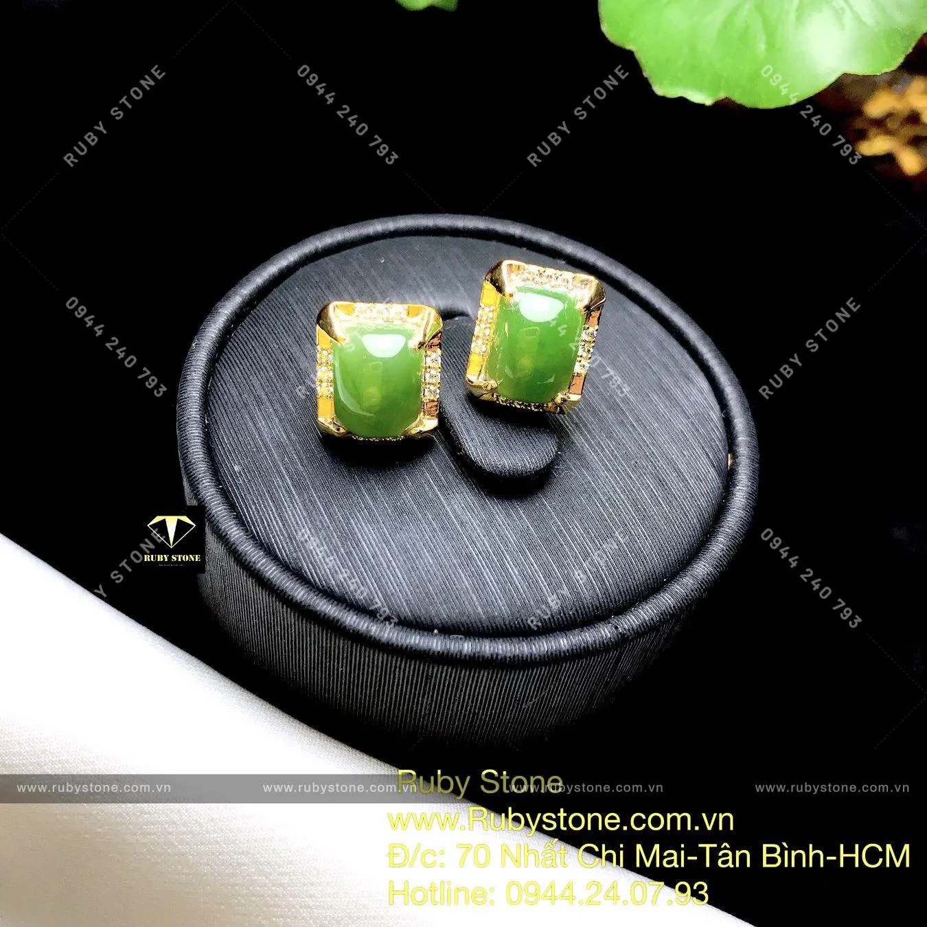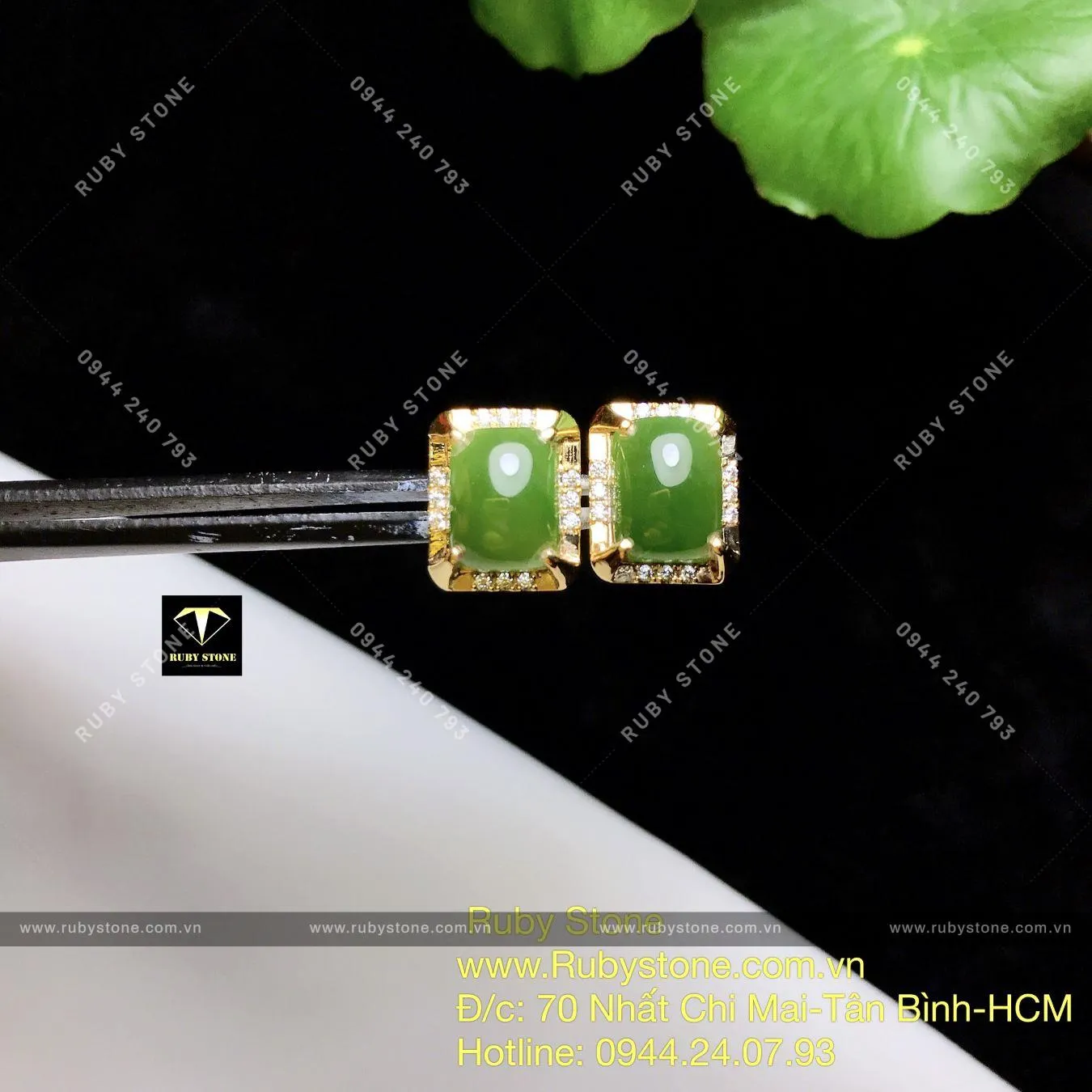 Khuyên Tai Ngọc Bích ổ Chữ Nhật, Vàng 10k - Ngọc Bích Phong Thủy