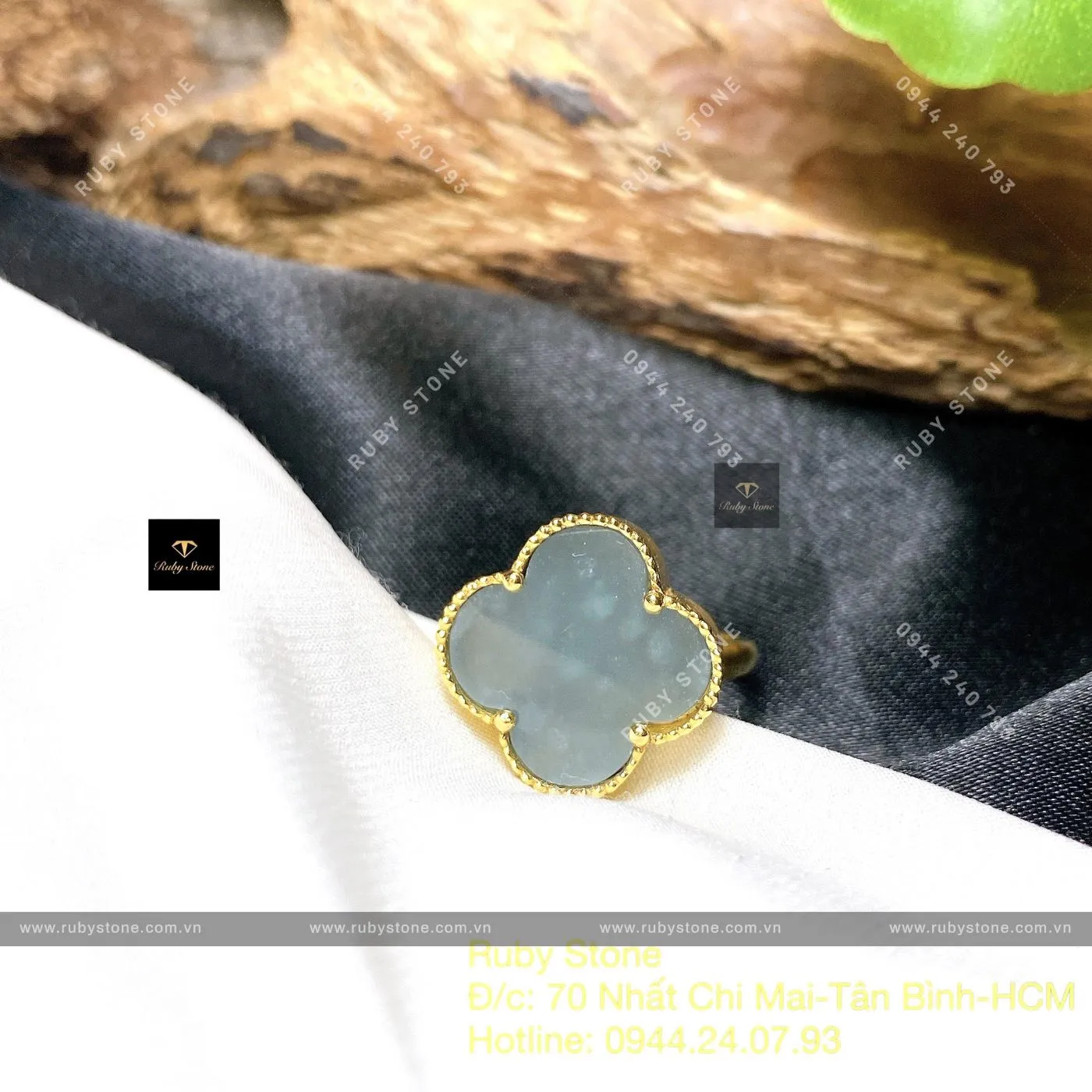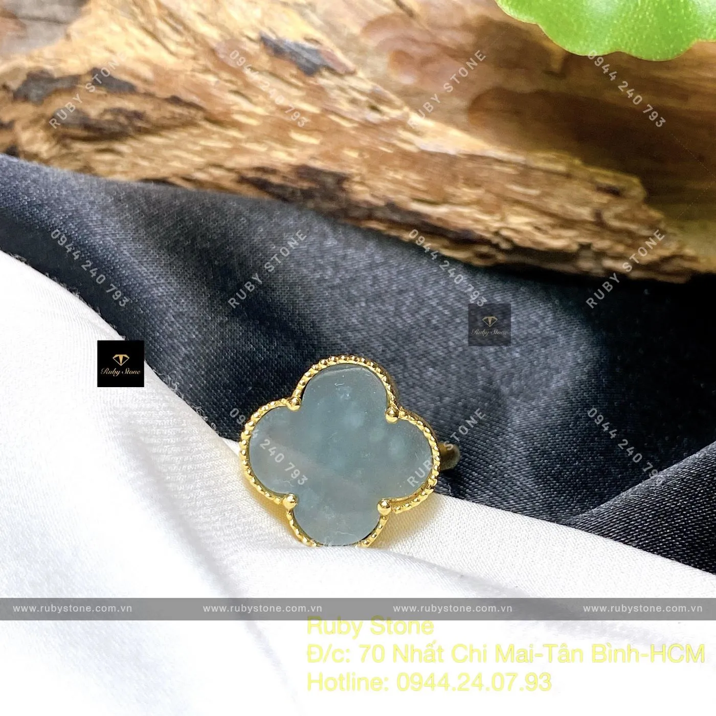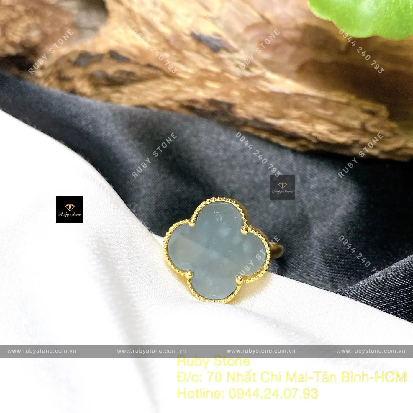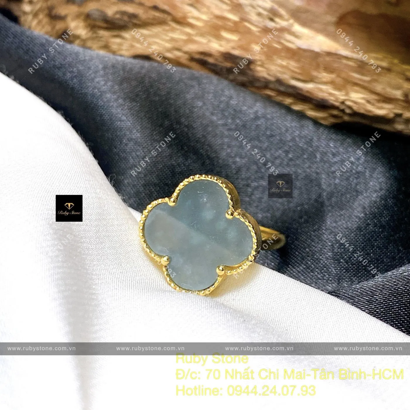 Nhẫn Cỏ Bốn Cánh Lam Ngọc, Vàng 18k - Ngọc Bích Phong Thủy