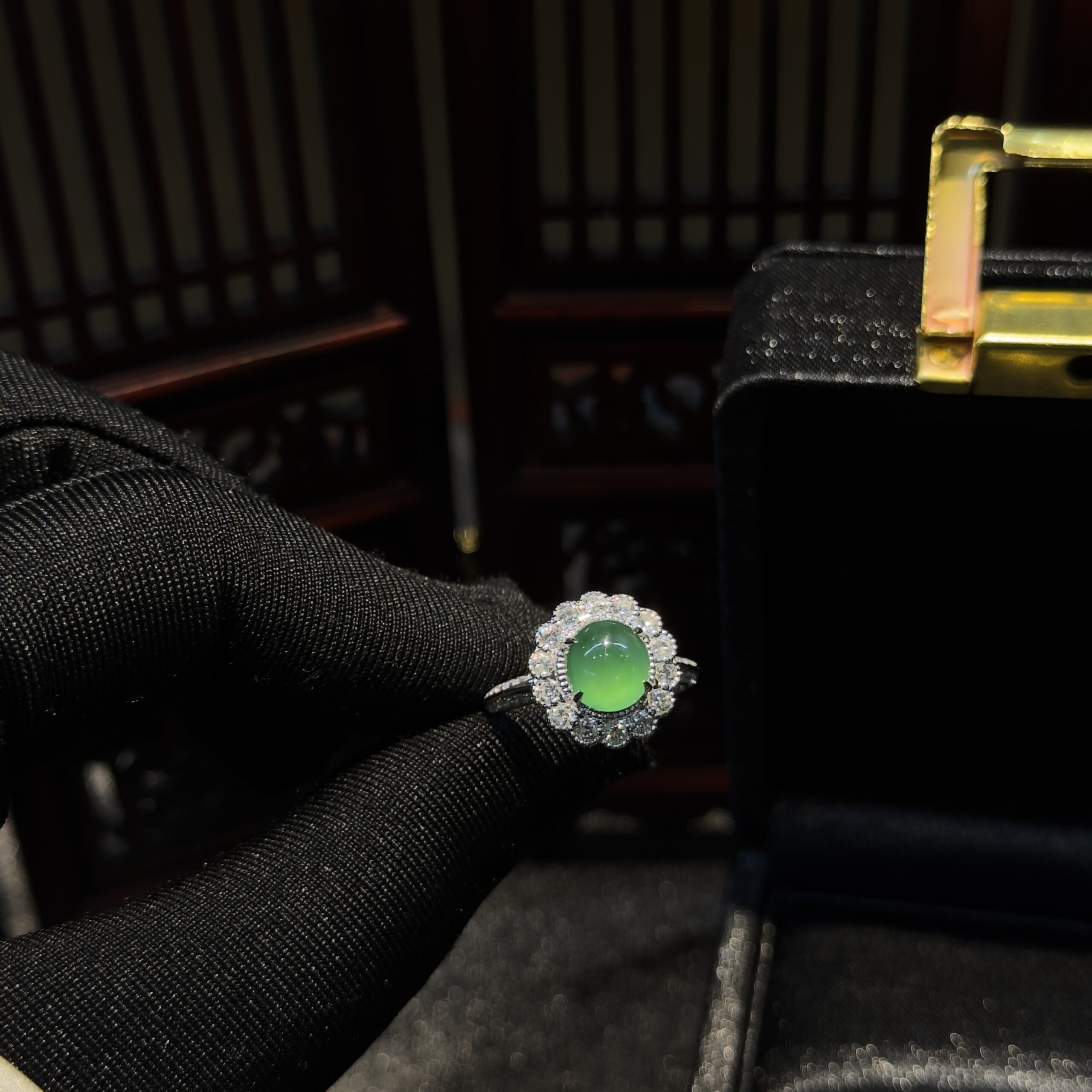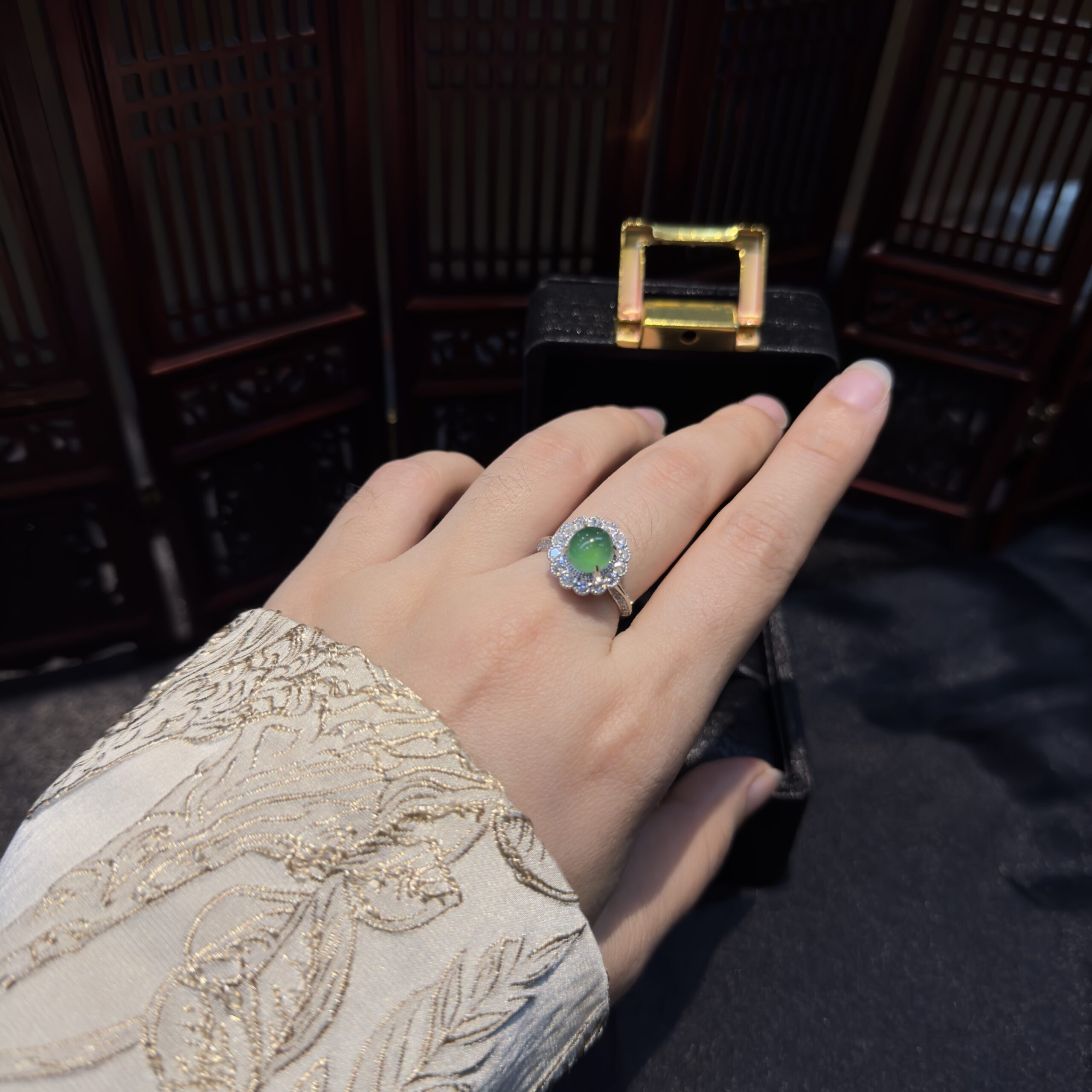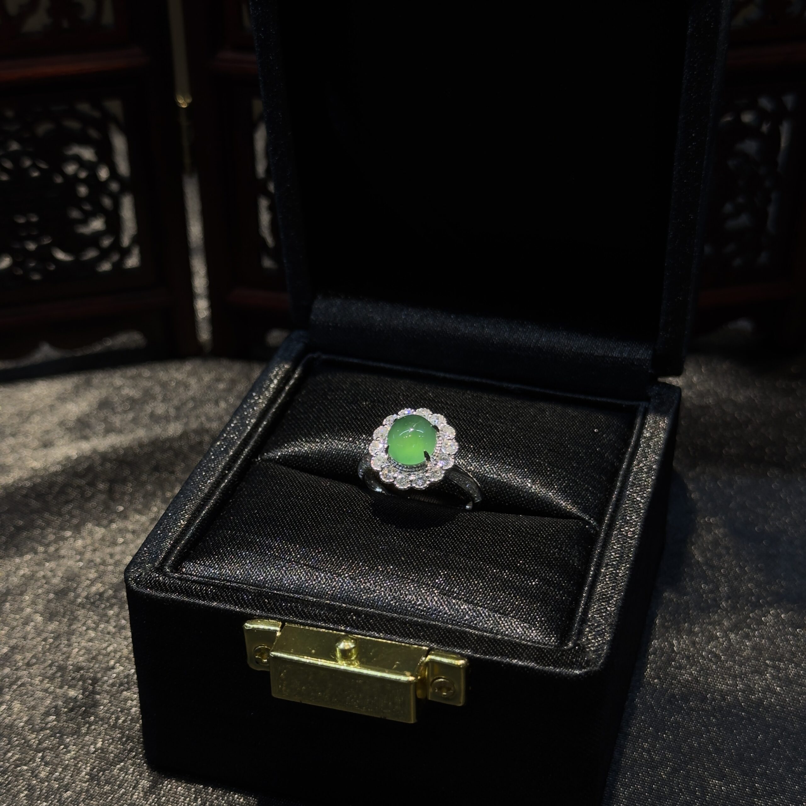 Họa tiết bao quanh: Viên ngọc chủ được bao bọc bởi một dải kim cương xếp theo hình cánh hoa, tạo nên hiệu ứng tương phản mạnh mẽ: sắc xanh của ngọc nổi bật trên nền trắng lấp lánh.