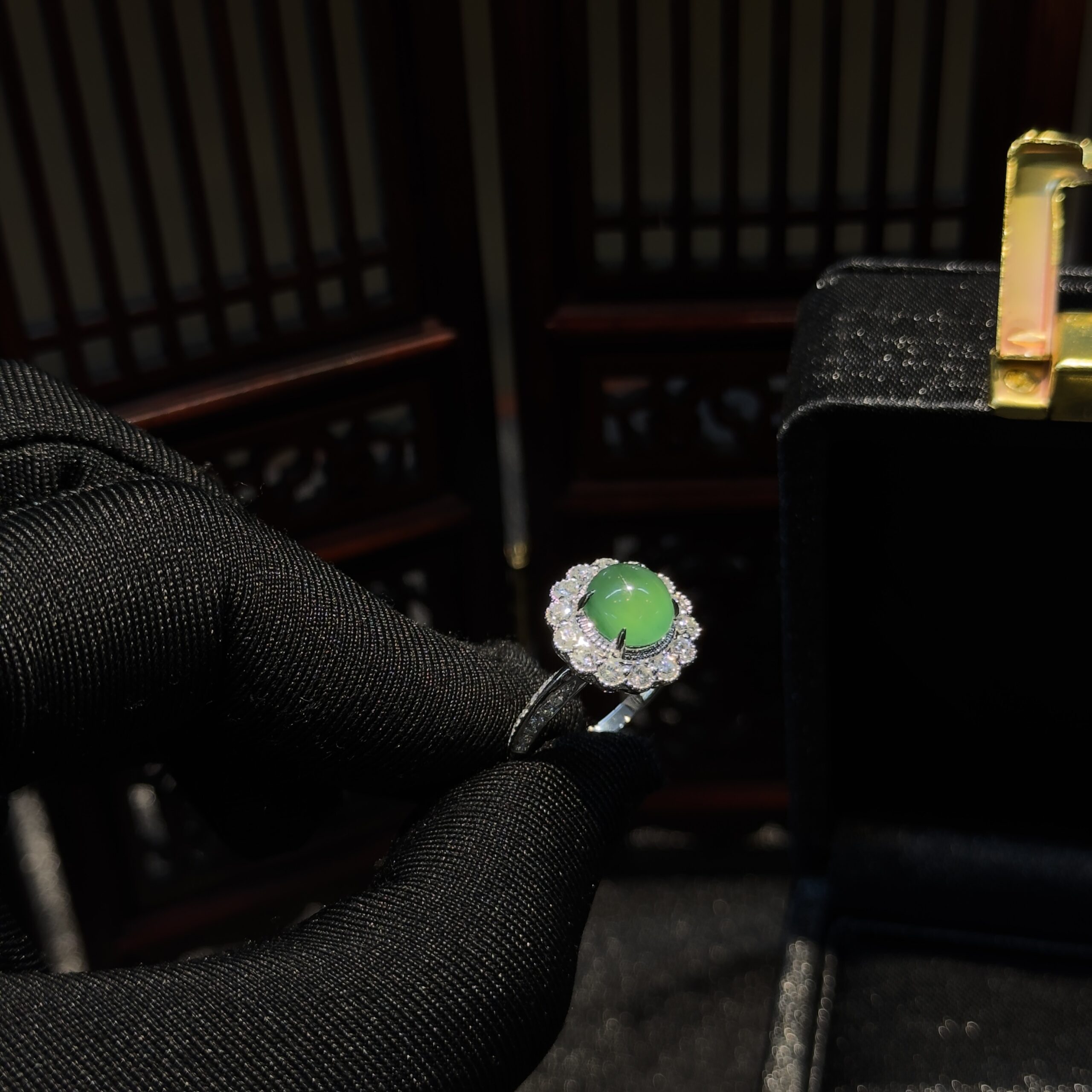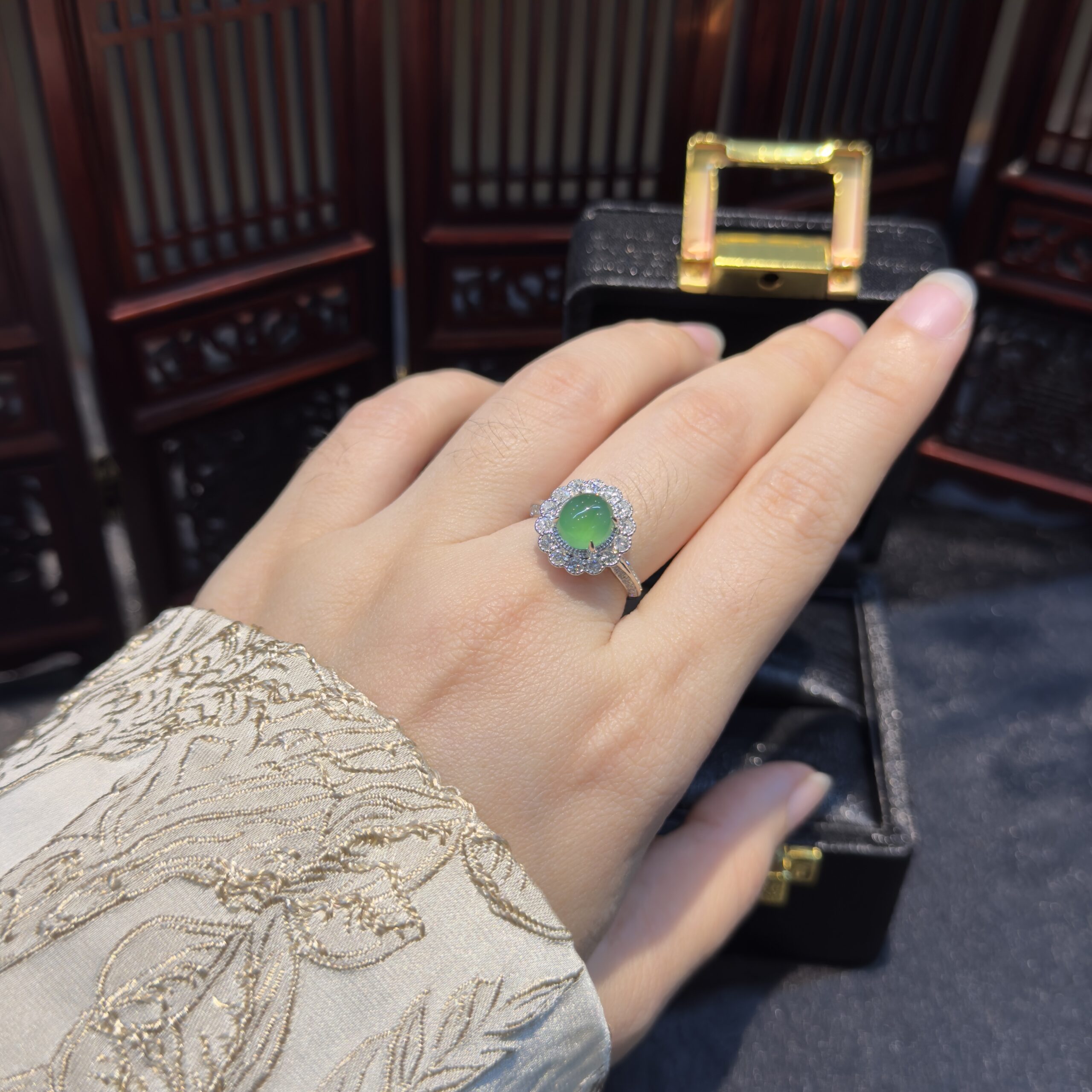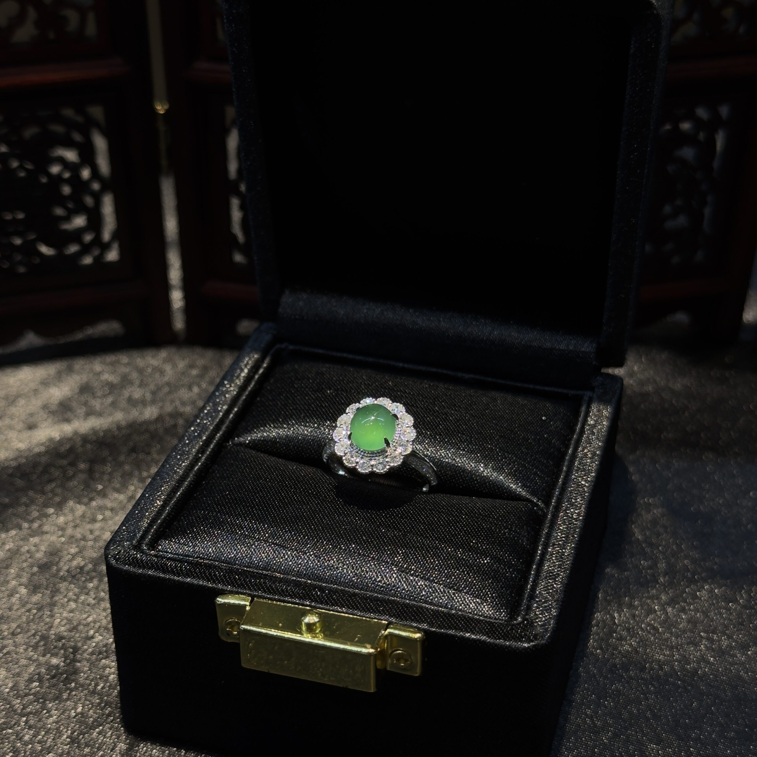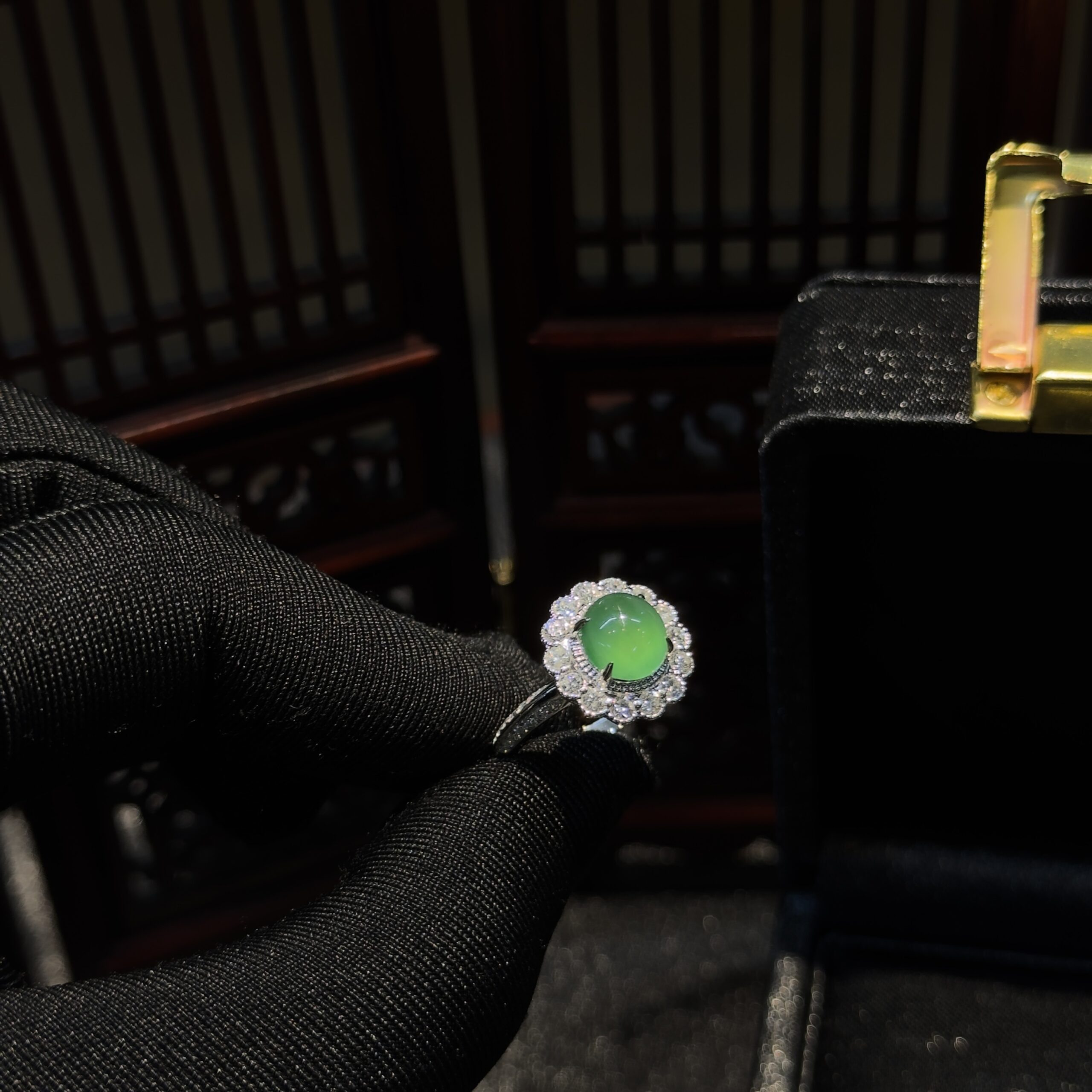 Họa tiết bao quanh: Viên ngọc chủ được bao bọc bởi một dải kim cương xếp theo hình cánh hoa, tạo nên hiệu ứng tương phản mạnh mẽ: sắc xanh của ngọc nổi bật trên nền trắng lấp lánh.