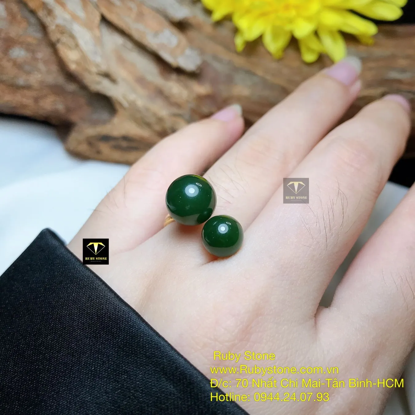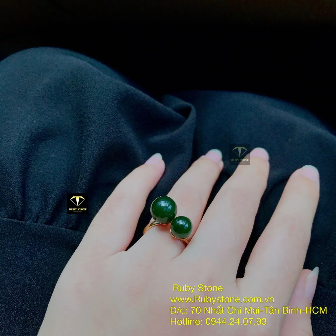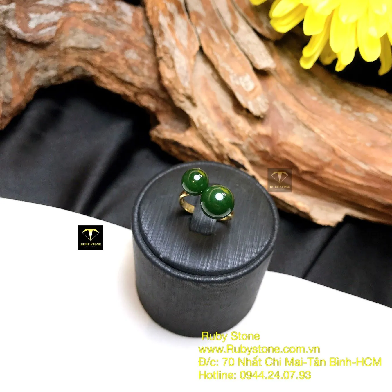 Nhẫn trái châu đôi Ngọc bích xanh đậm, vàng 18k