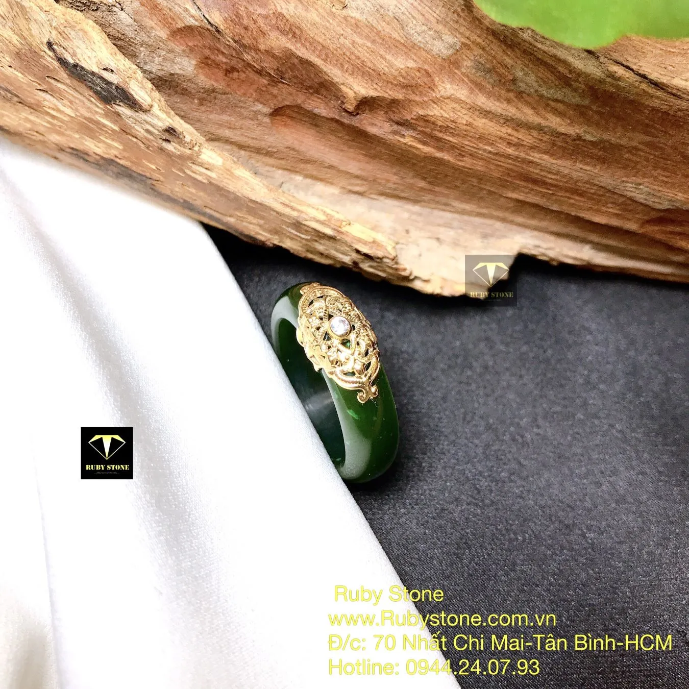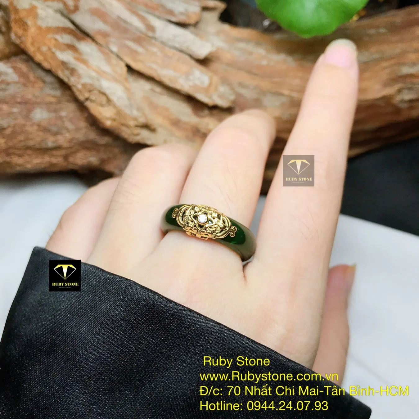 Nhẫn tròn Ngọc bích hoa văn tấm trắng, vàng 10k
