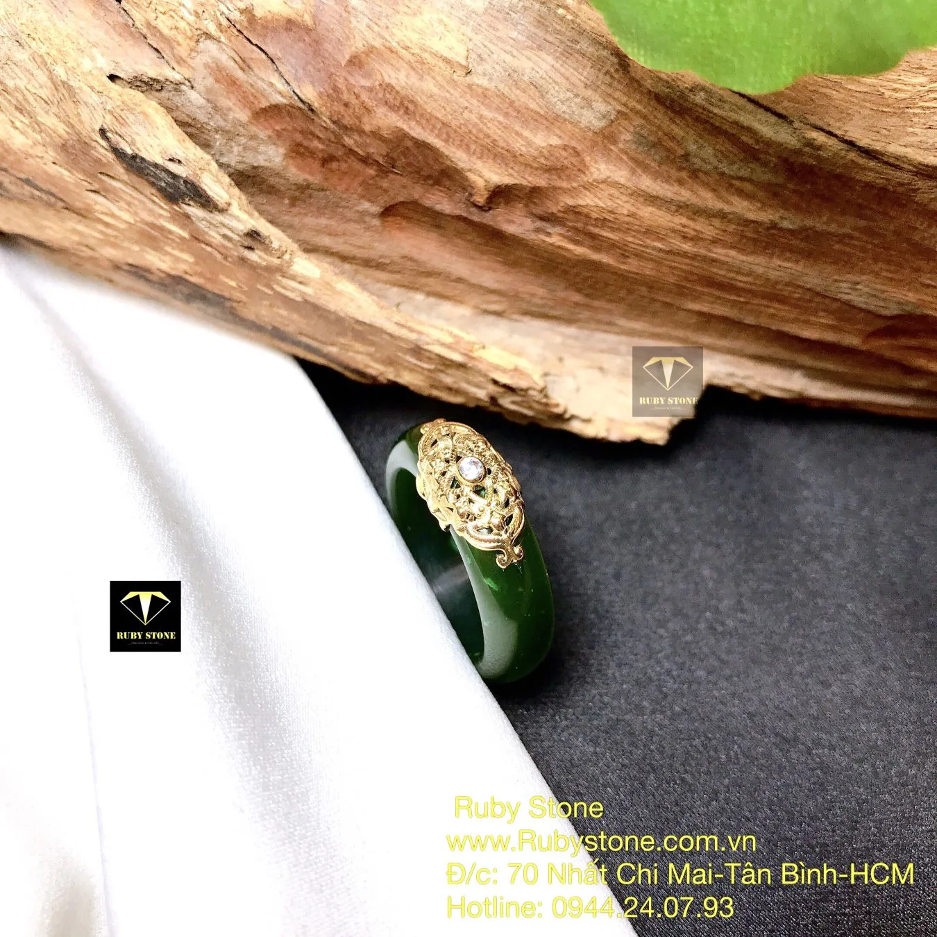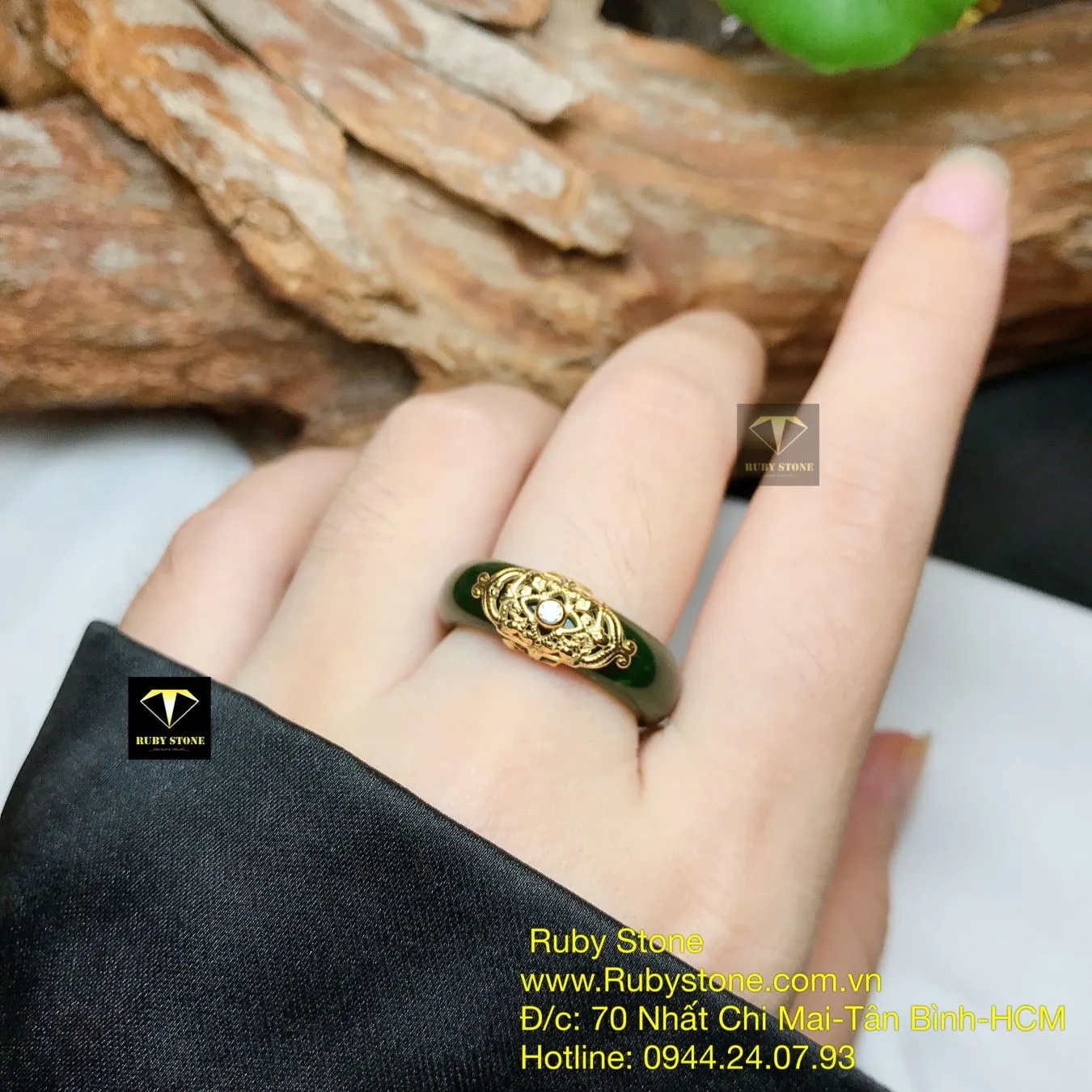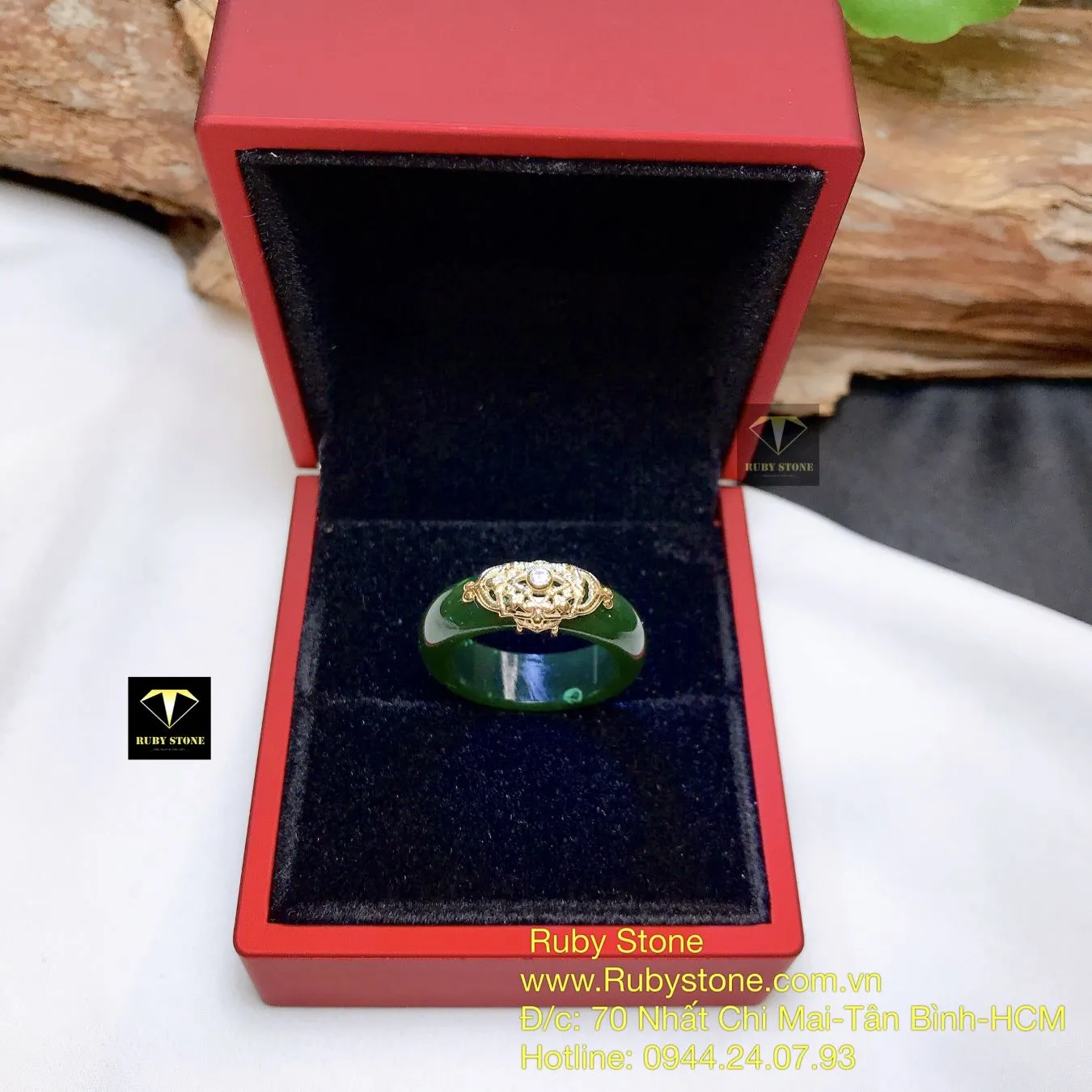 Nhẫn Tròn Ngọc Bích Hoa Văn Tấm Trắng, Vàng 10k - Ngọc Bích Phong Thủy
