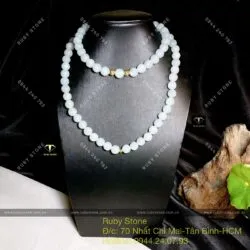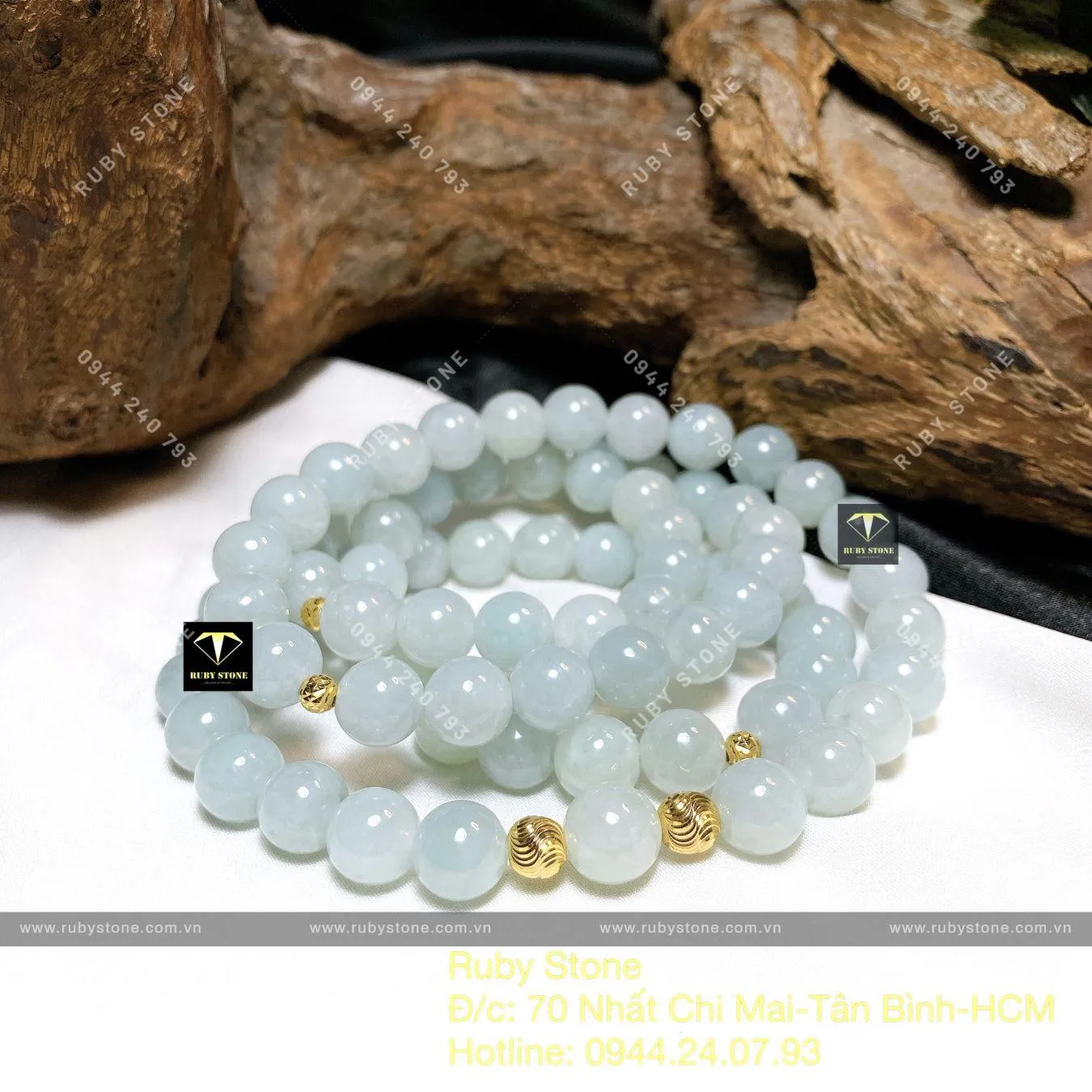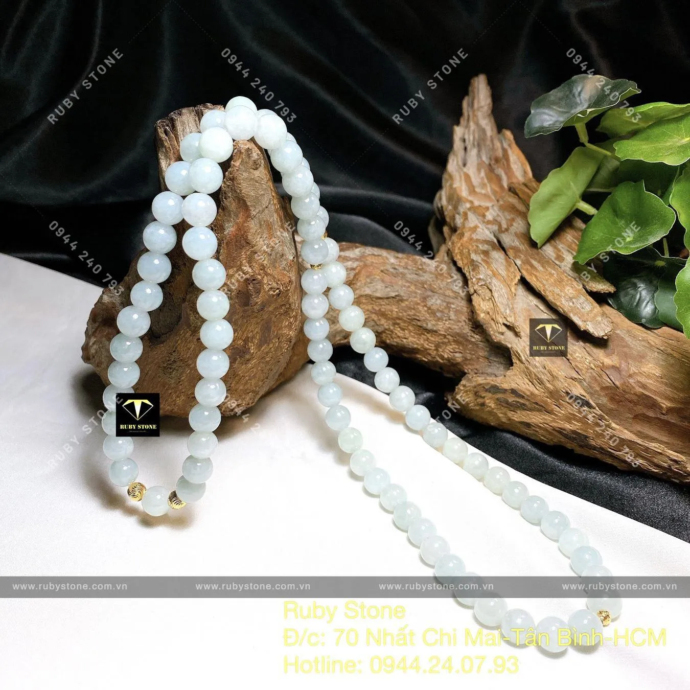 Vòng cổ ngọc Cẩm thạch xanh lơ 9,6 ly mix bi vàng 18k