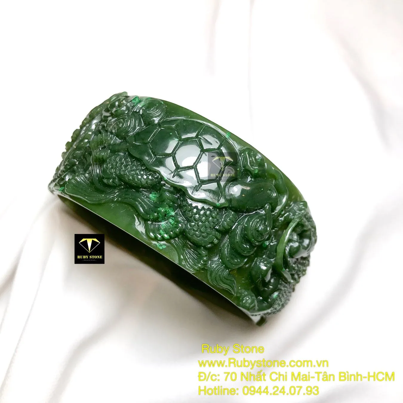 Vòng ngọc bích Canada chạm Tứ linh (Long – Lân – Quy – Phụng), bản 30mm