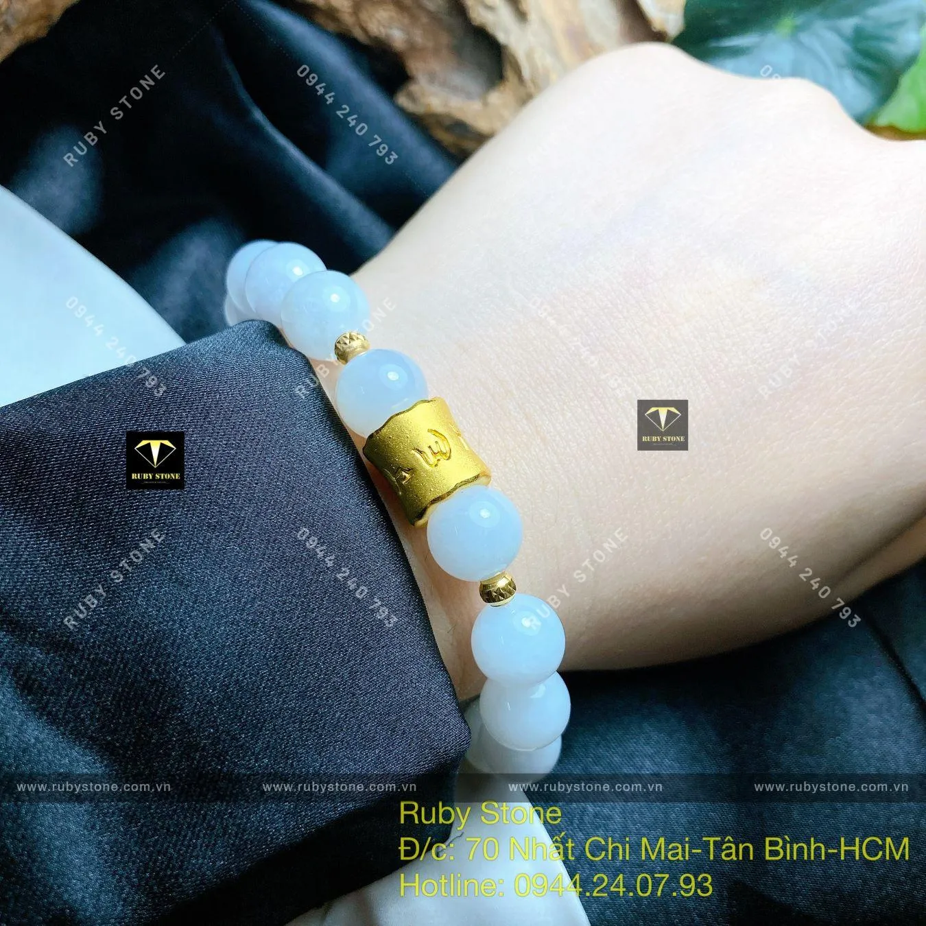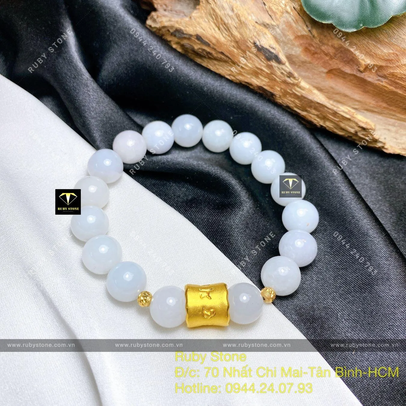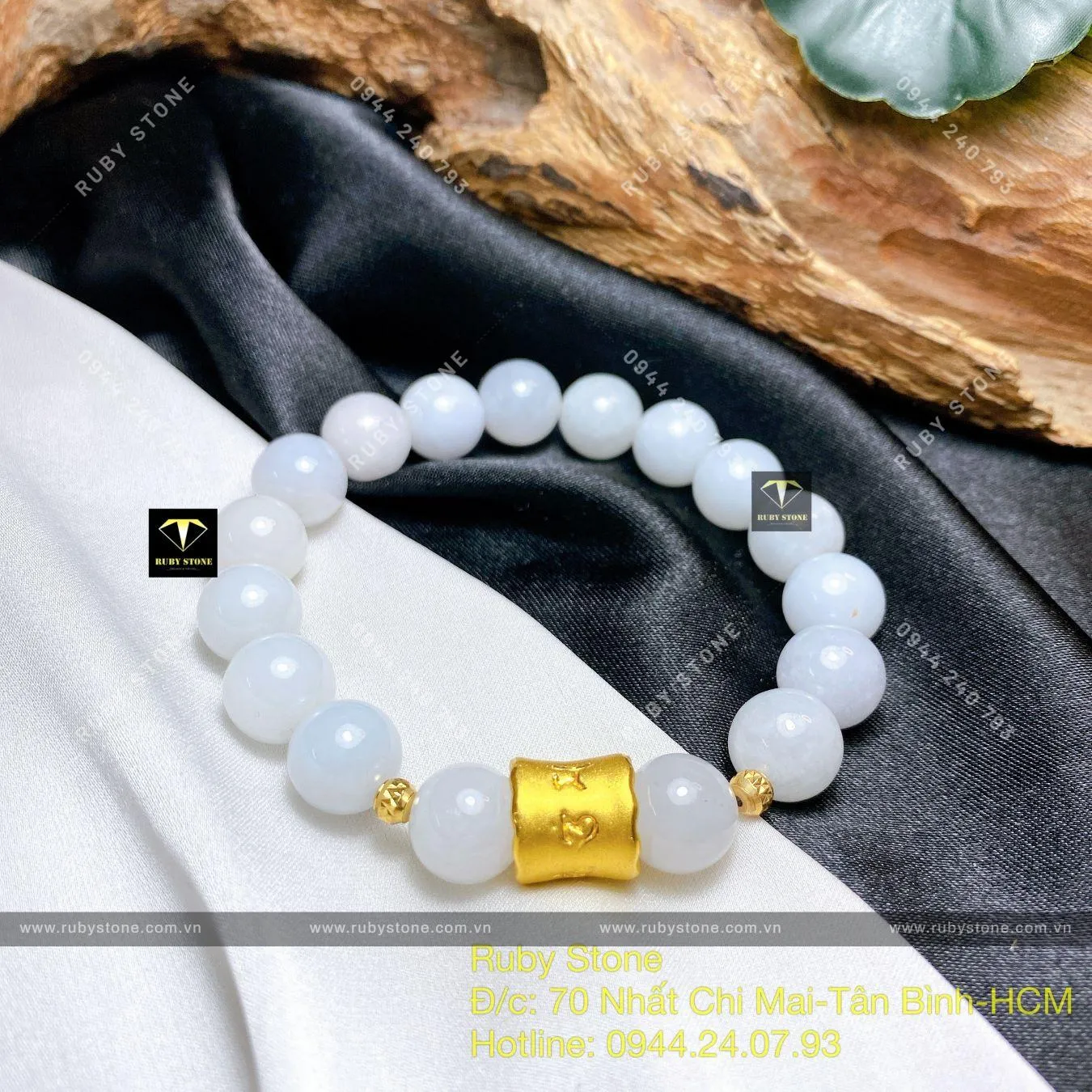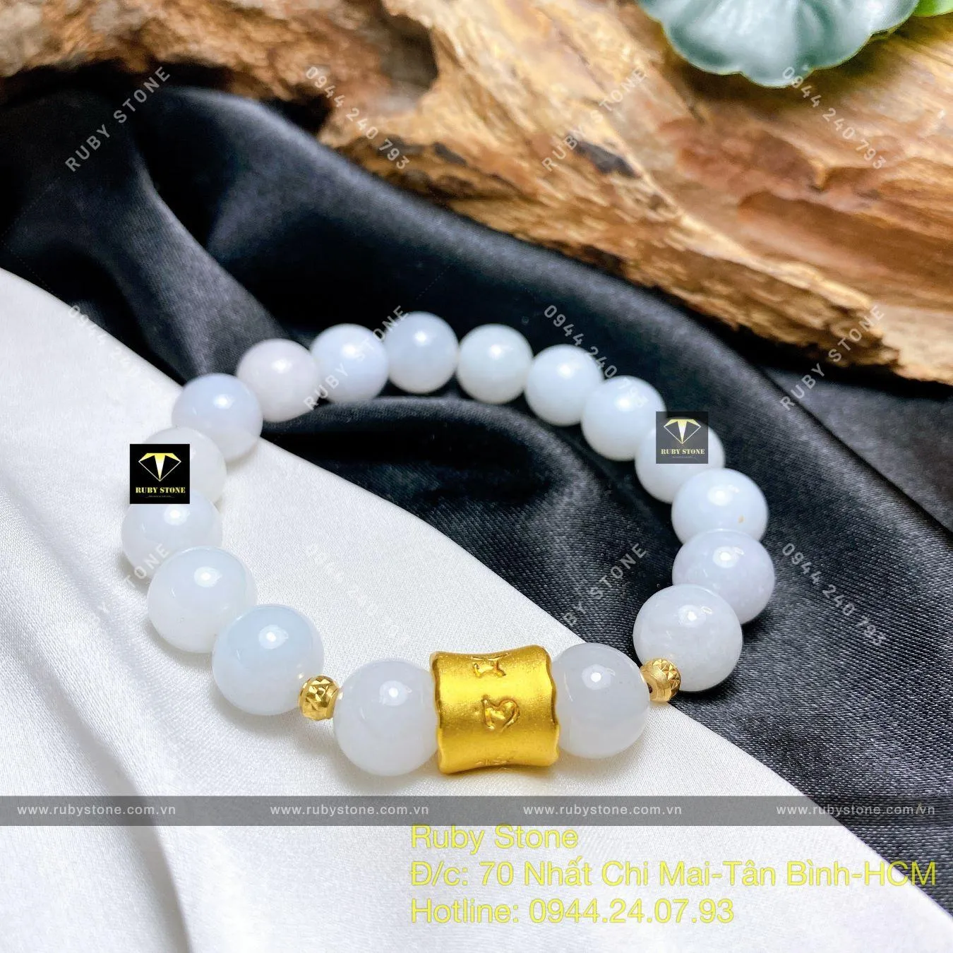 Vòng ngọc Cẩm thạch trắng mix charm vàng 24k